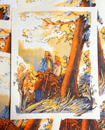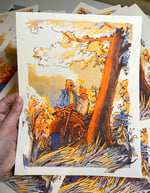 Print measures 8.5x11" and is 3 color risograph printed on 70lb off-white speckletone paper in sunflower, fluorescent orange, and blue.