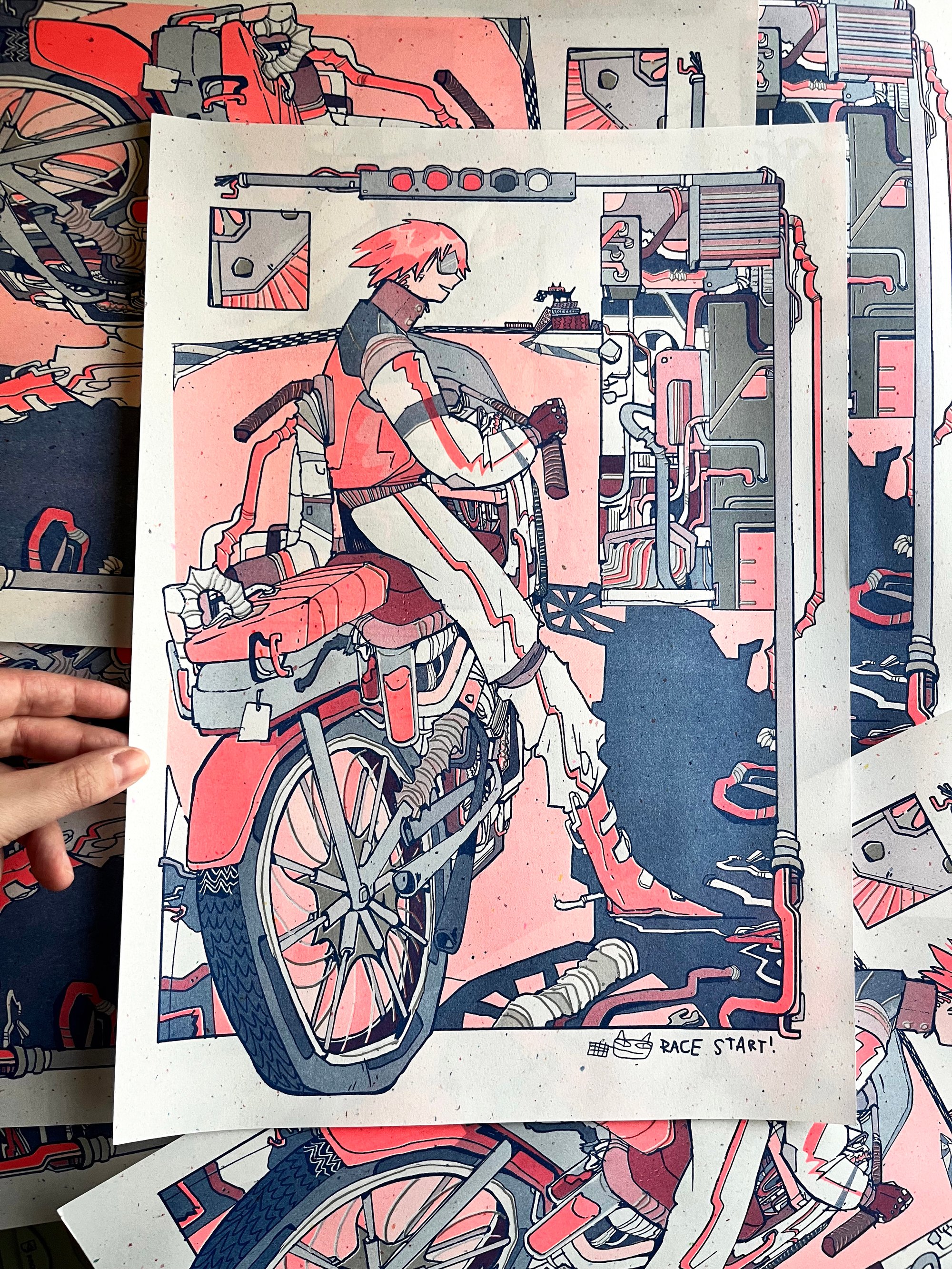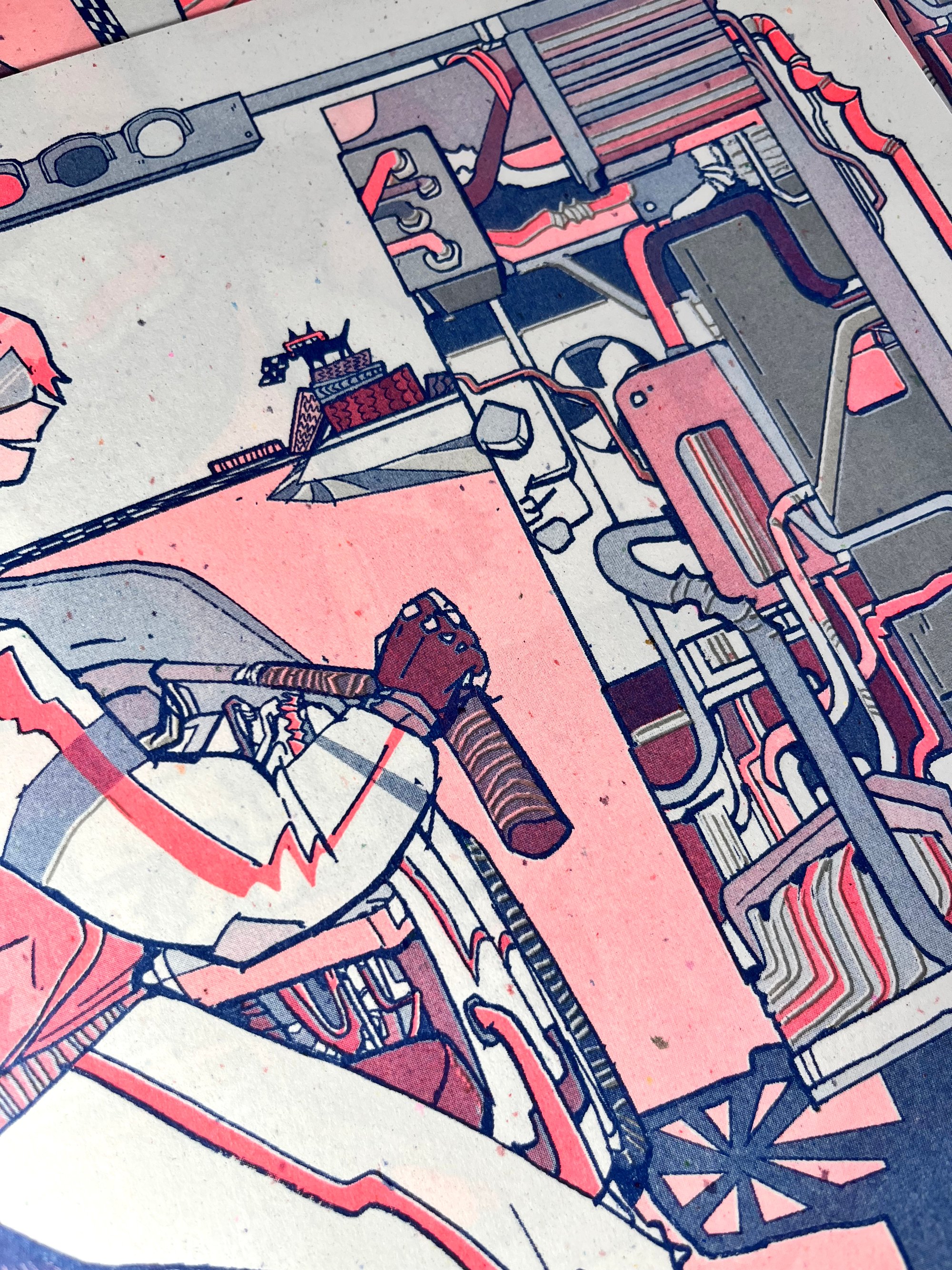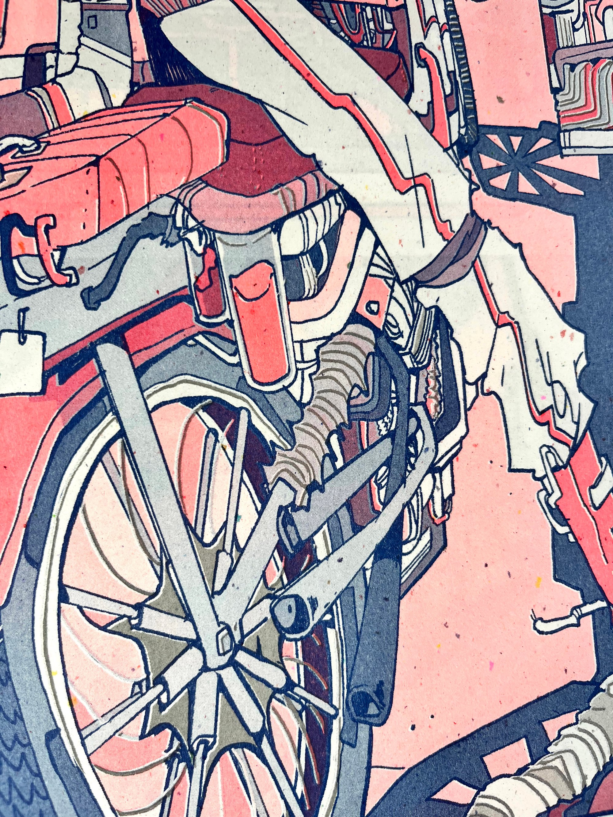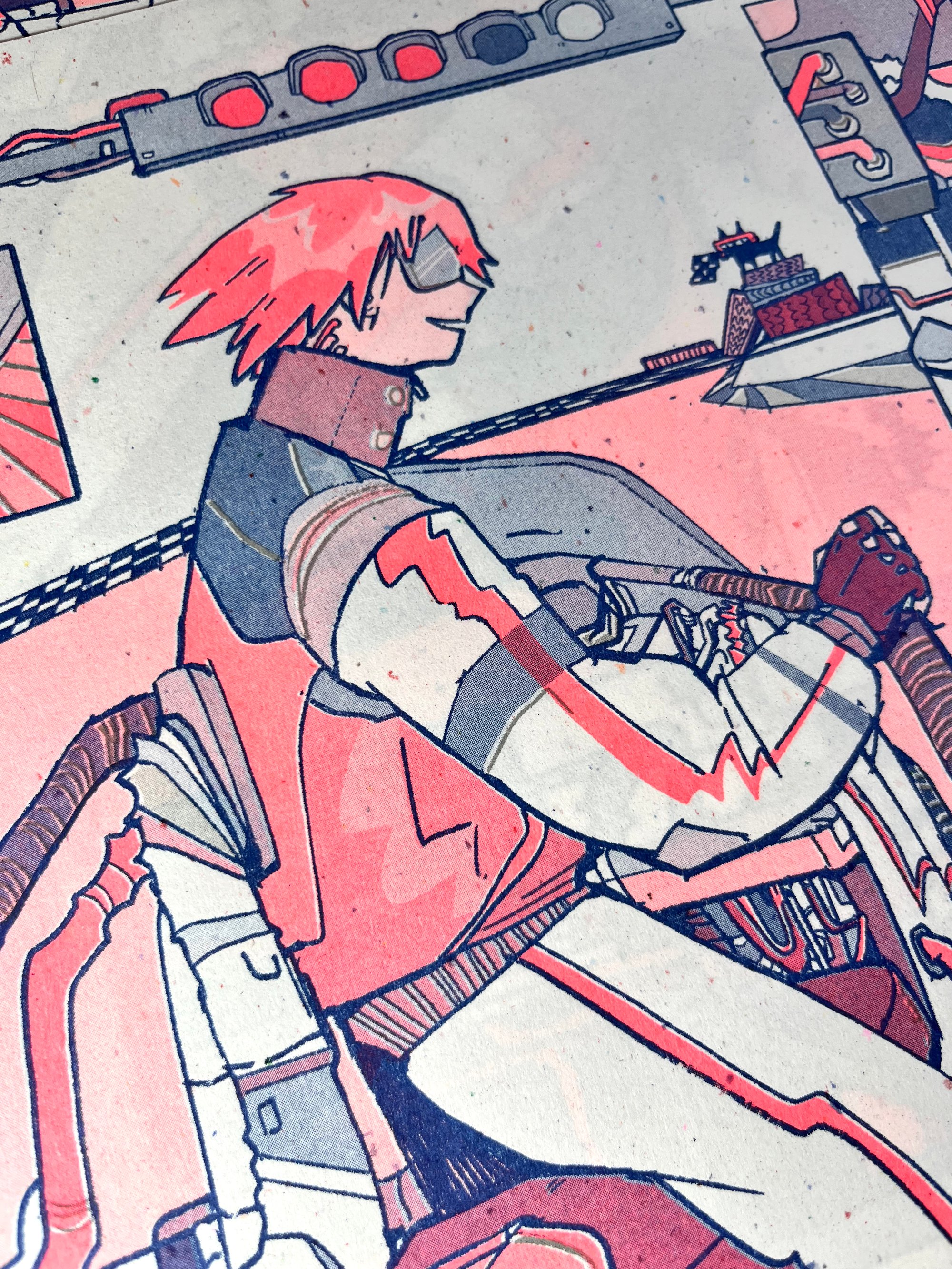 Print measures 11.69"x16.54" (A3 size). Printed in ash, fluorescent red, and dark blue at RETROJAM.