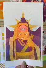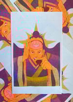 Print measures approximately 5x8.5" and is three color risograph printed in sunflower, fluorescent orange, and violet on off-white speckletone paper.