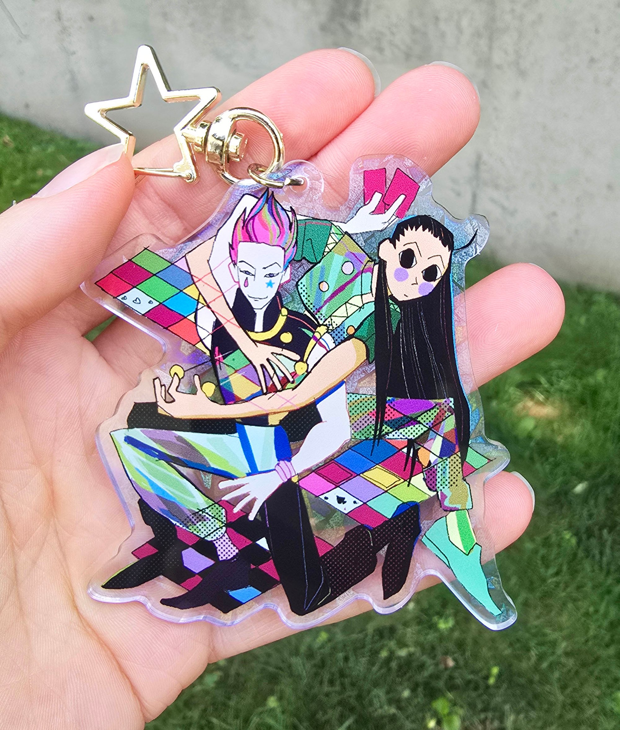 Each charm measures roughly 3" and is double side printed on holographic acrylic and comes with a gold star clasp.