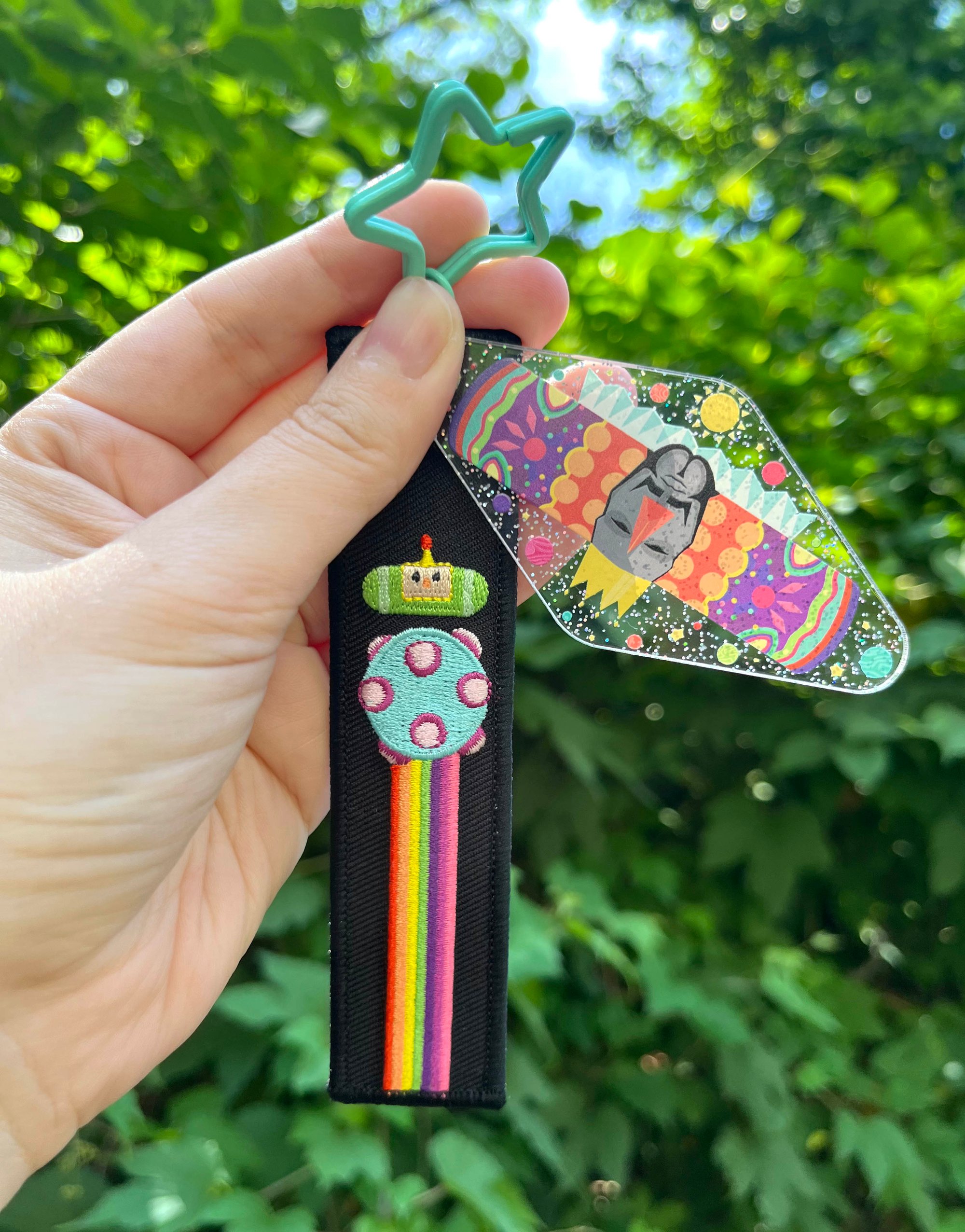 Take the King of All Cosmos wherever you go! Keychain comes with both a 5" fabric strap and a glitter keytag of The King, clipped to a star keyring. Fabric strap is double side embroidered, key tag is single side printed.