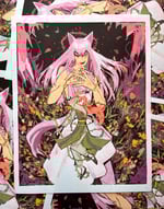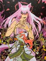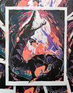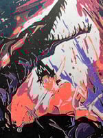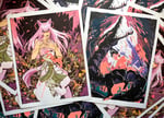 Each print measures 8.5x11 and is four color risograph printed. Kurama is printed in lime green, fluorescent orange, violet, and black, Hiei is printed in fluorescent orange, violet, teal and black. Both are on 70lb off-white speckletone paper.