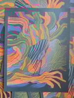 Print measures 8.5x11" and is three color risograph printed in sunflower, fluorescent orange, and violet on black paper.