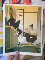 Print measures 8.5x11" and is three color risograph printed in sunflower, fluorescent orange, and teal on cream speckletone paper.