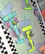 Print measures approx 5.8"x16.5" (A3 LONG). Risograph printed in fluorescent yellow, fluorescent pink, mint, and black at RETROJAM.