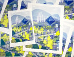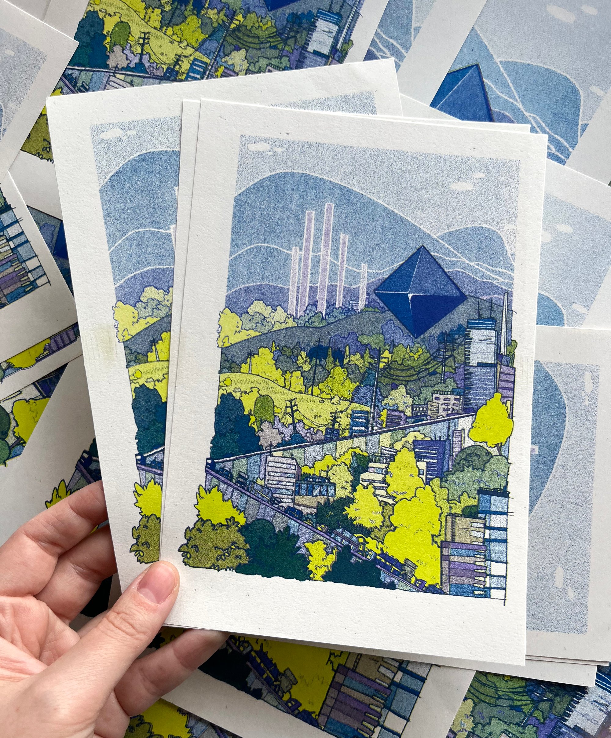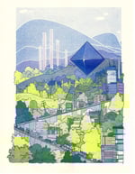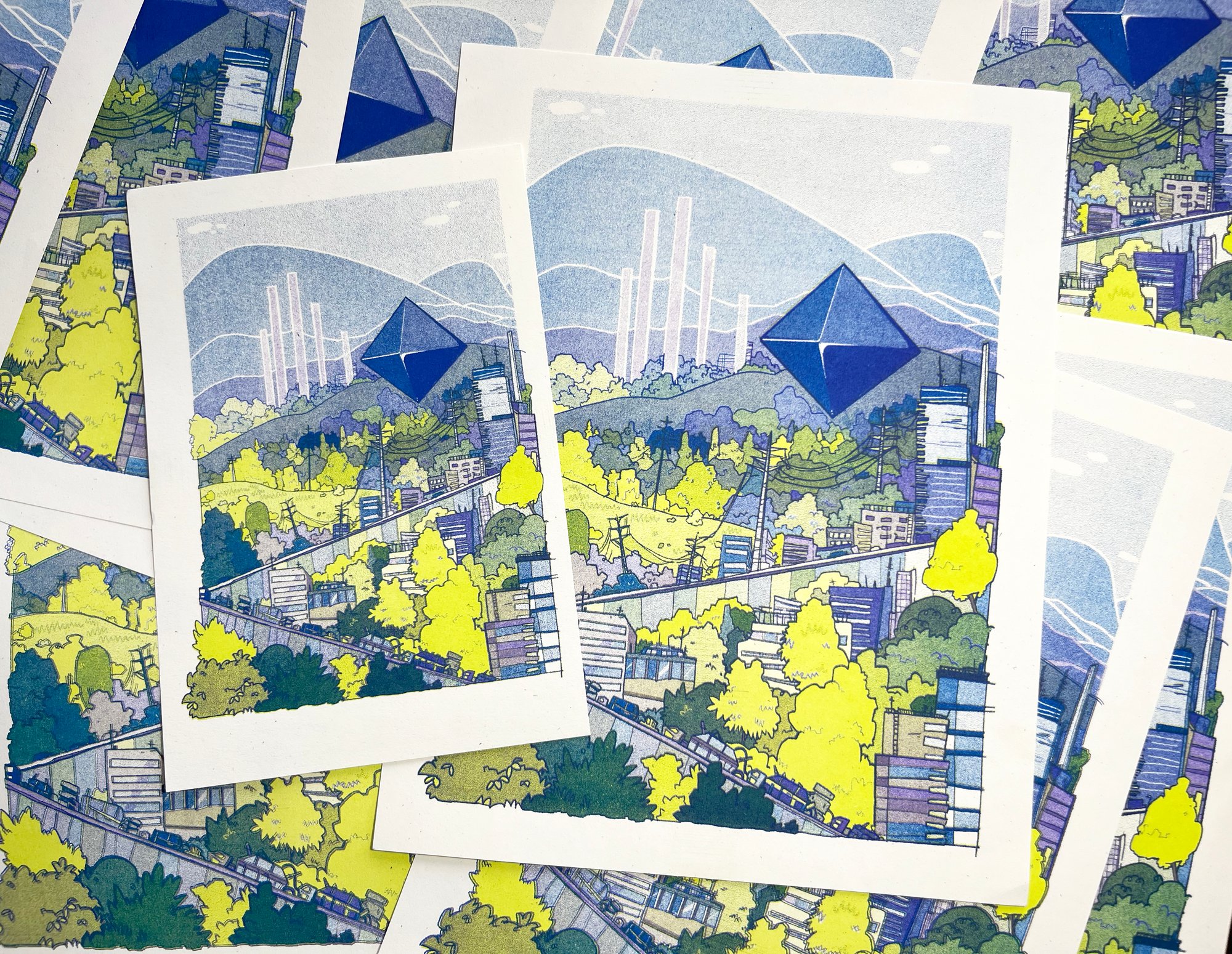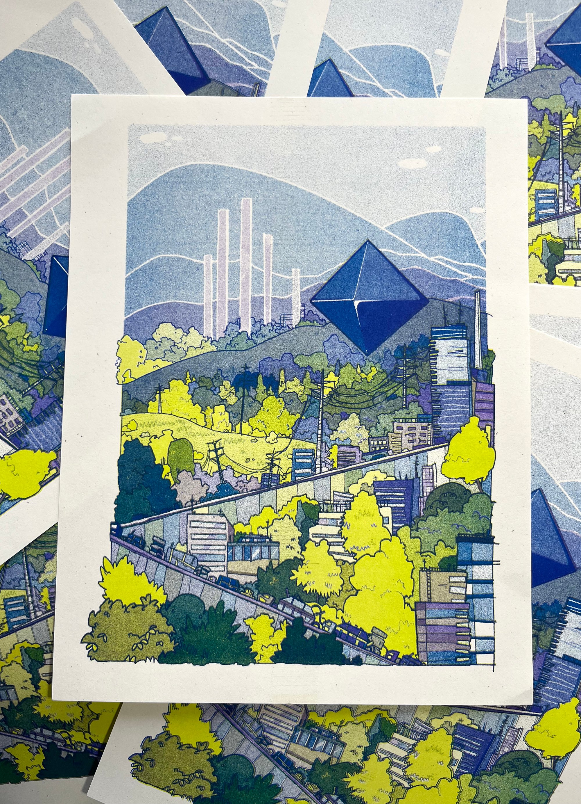 Risograph print of the angel Ramiel from Evangelion. Print is three color risograph printed in lime, violet, and blue, and is available in two sizes, 5.5x8.5" and 8.5x11".