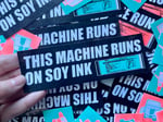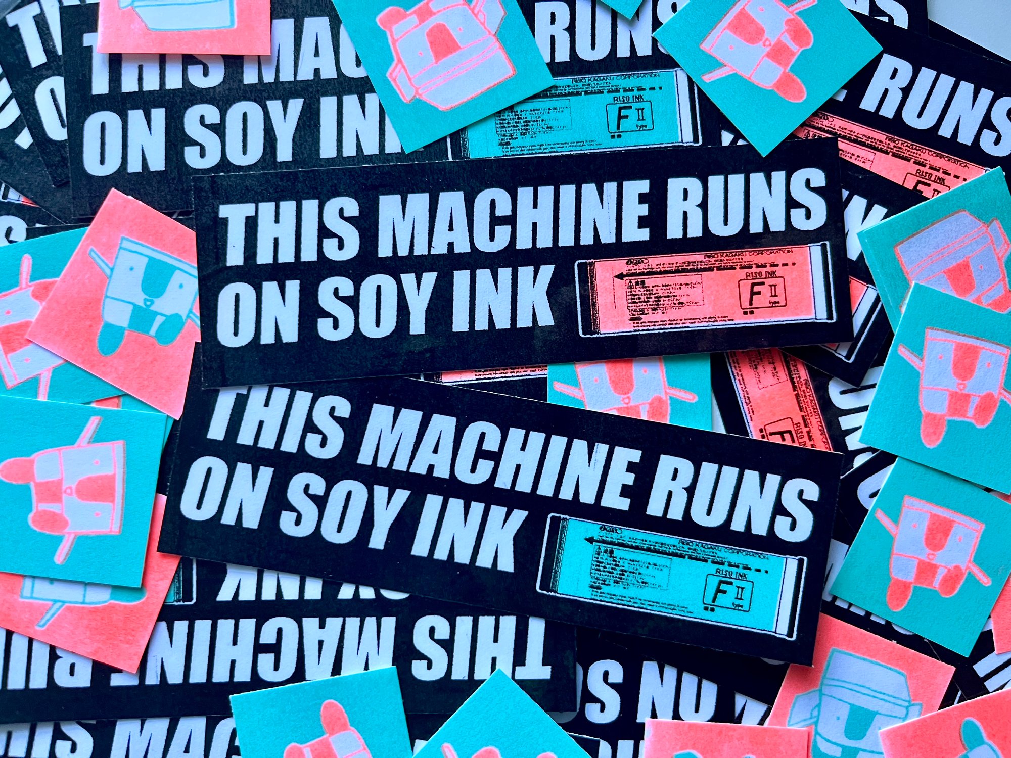 Riso printed sticker celebrating the riso! Yes, I do know FII ink is rice based and soy.