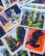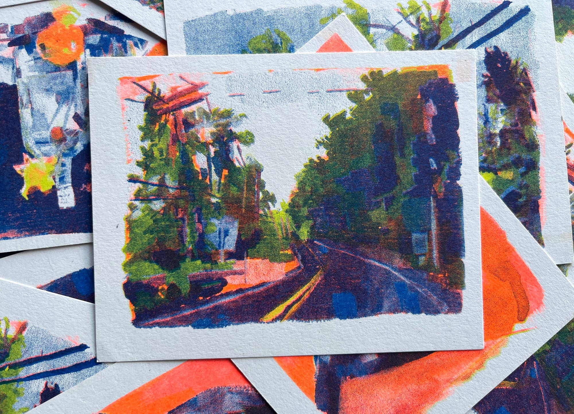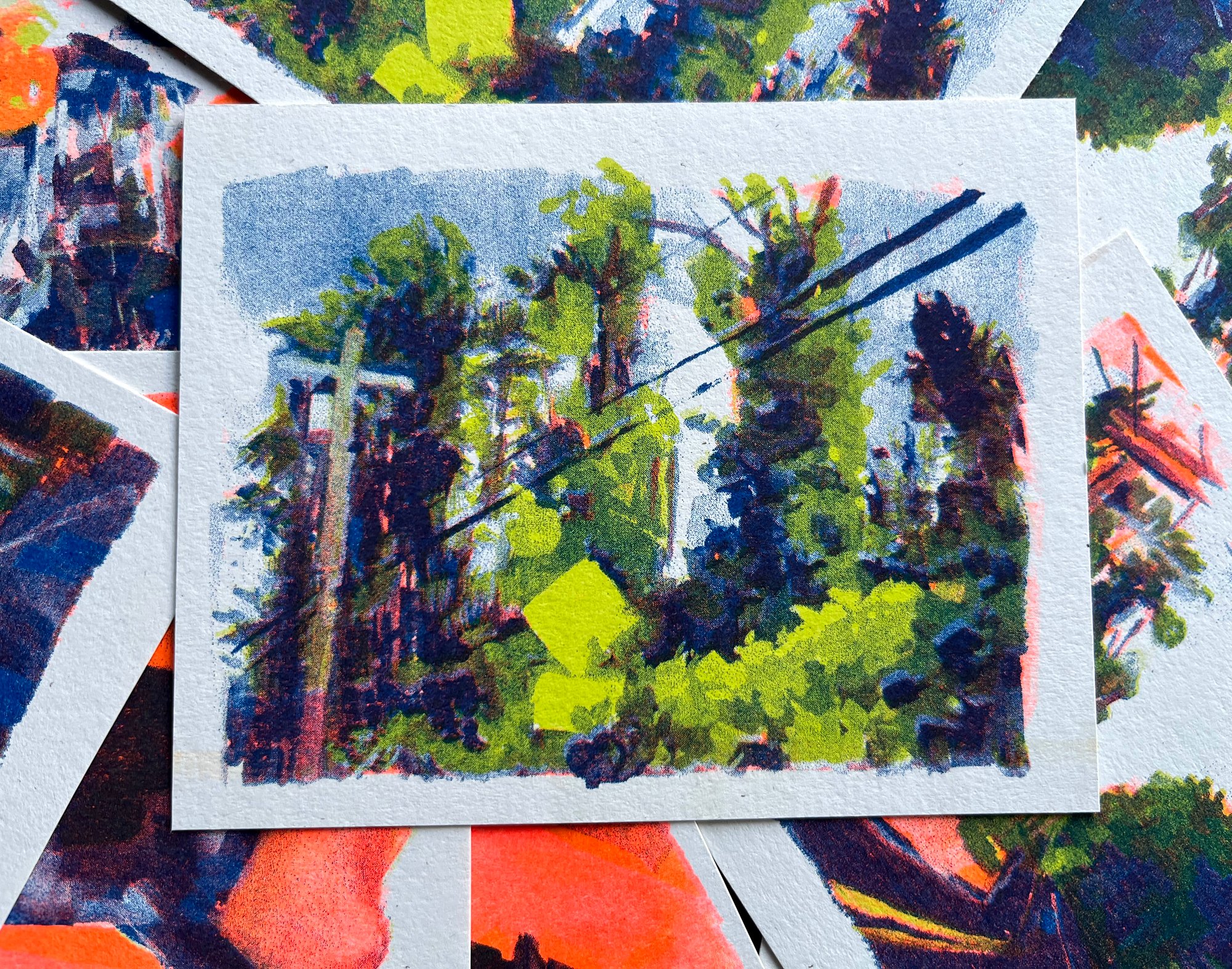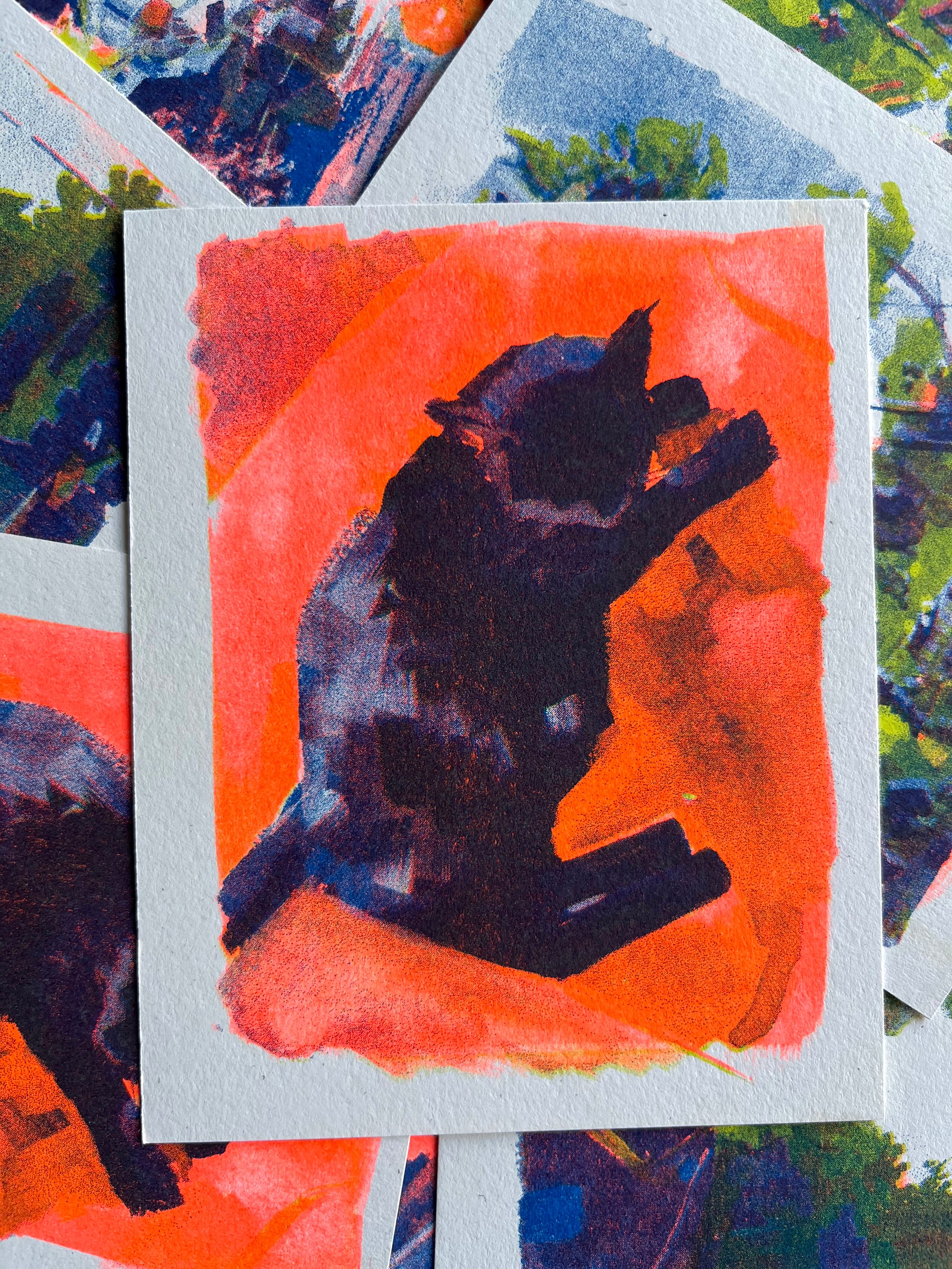 Tiny risograph prints of gouache paintings. Prints measure approx 4.25x5" and are printed on off-white cardstock in fluorescent orange, lime, and blue.