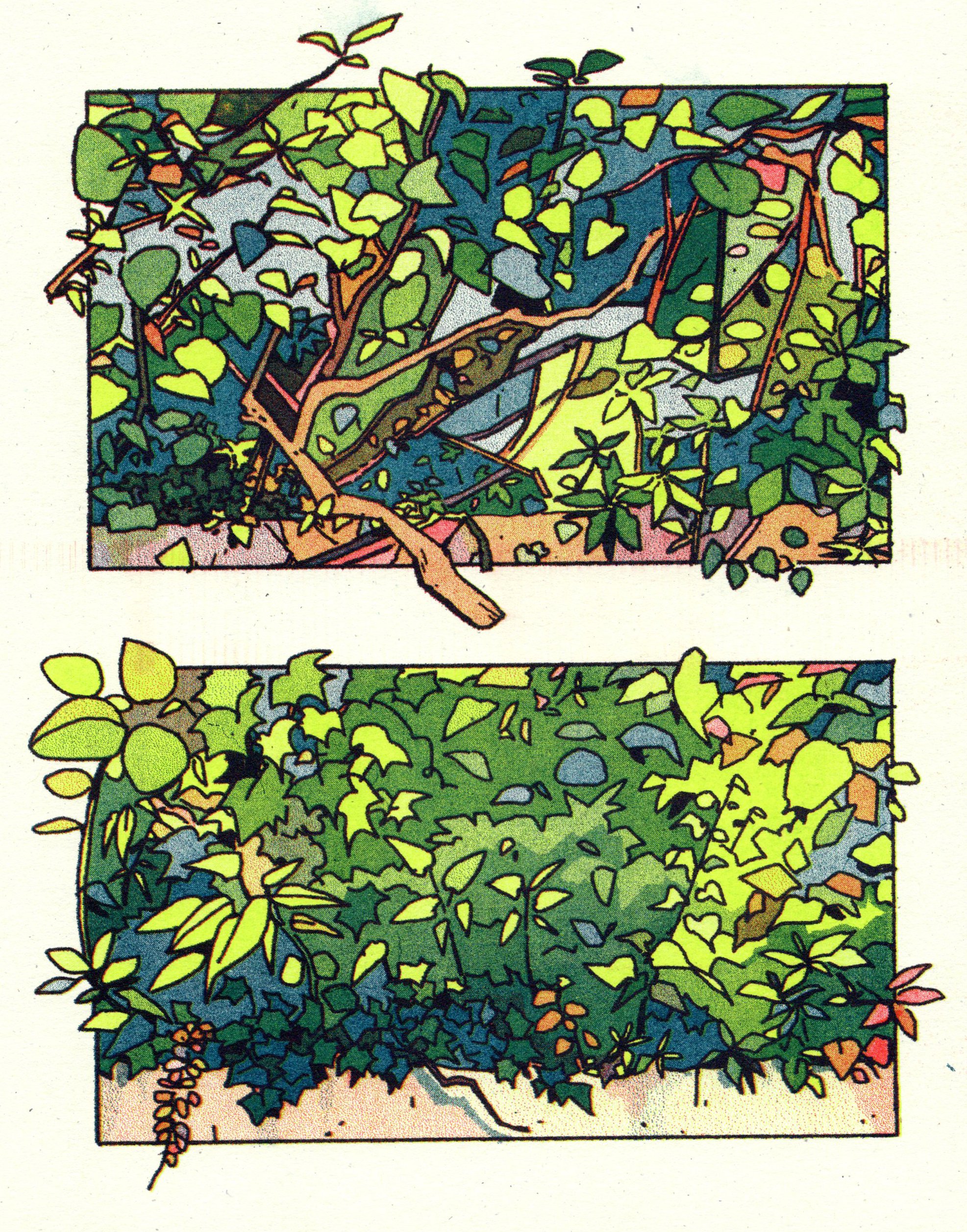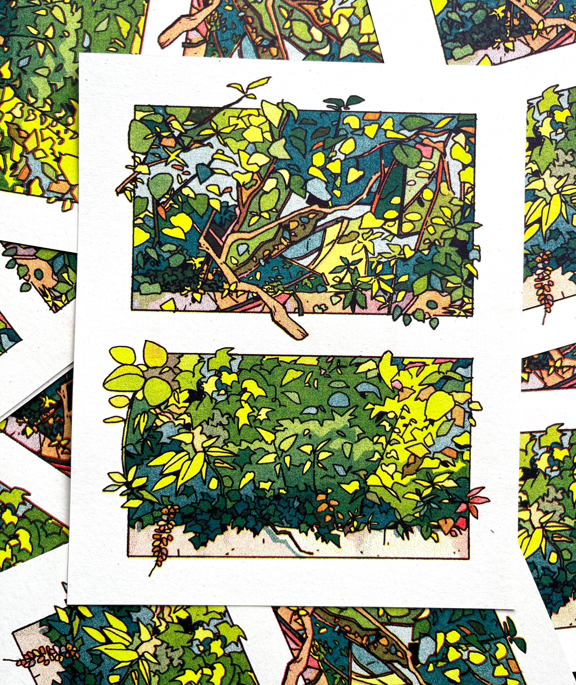 Risograph print in lime, scarlet, and teal. Print measures approx 7x8.5" and is printed on milkweed cover weight paper.